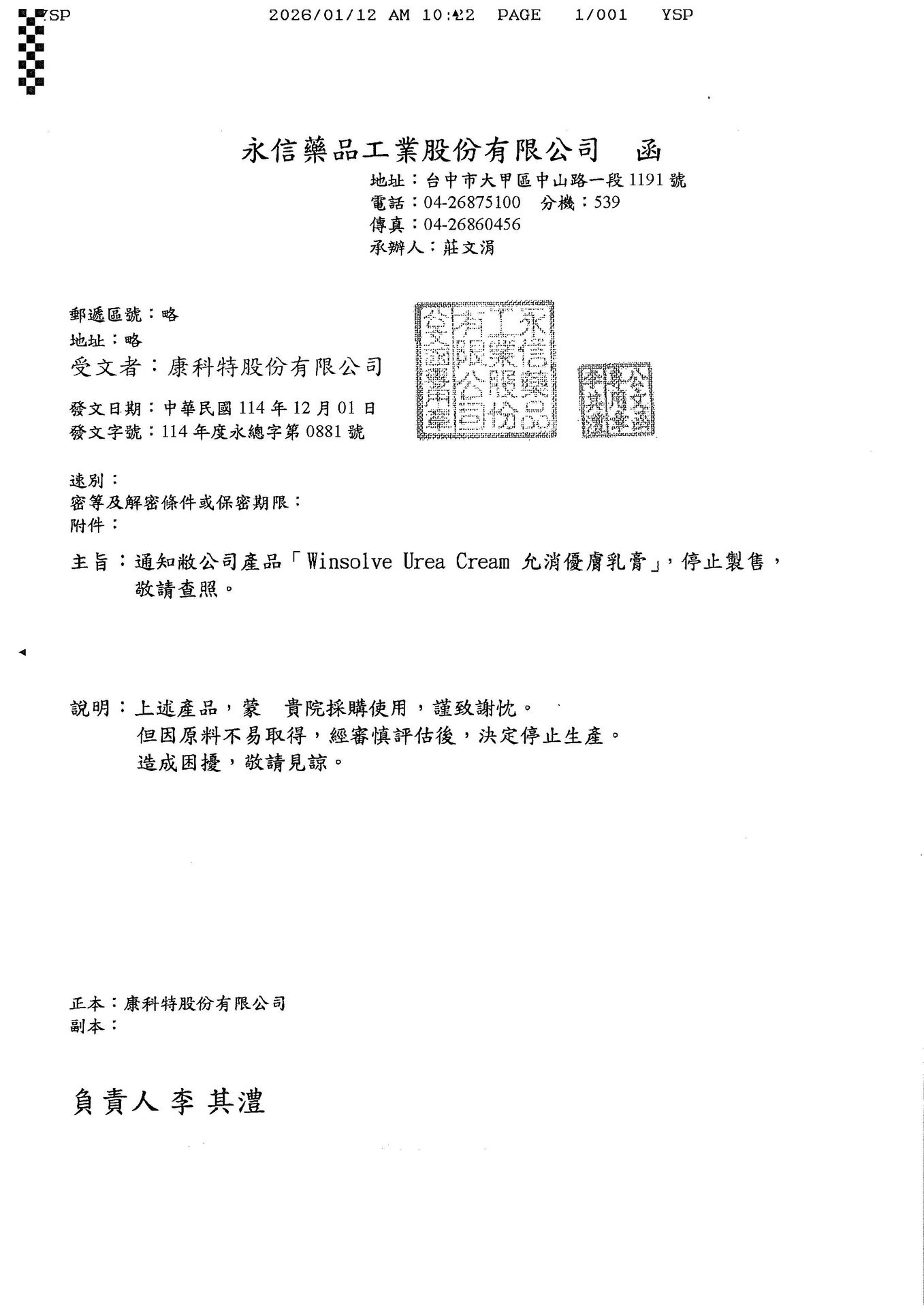 公告 2026/01/12 永信-允消優膚乳膏停售